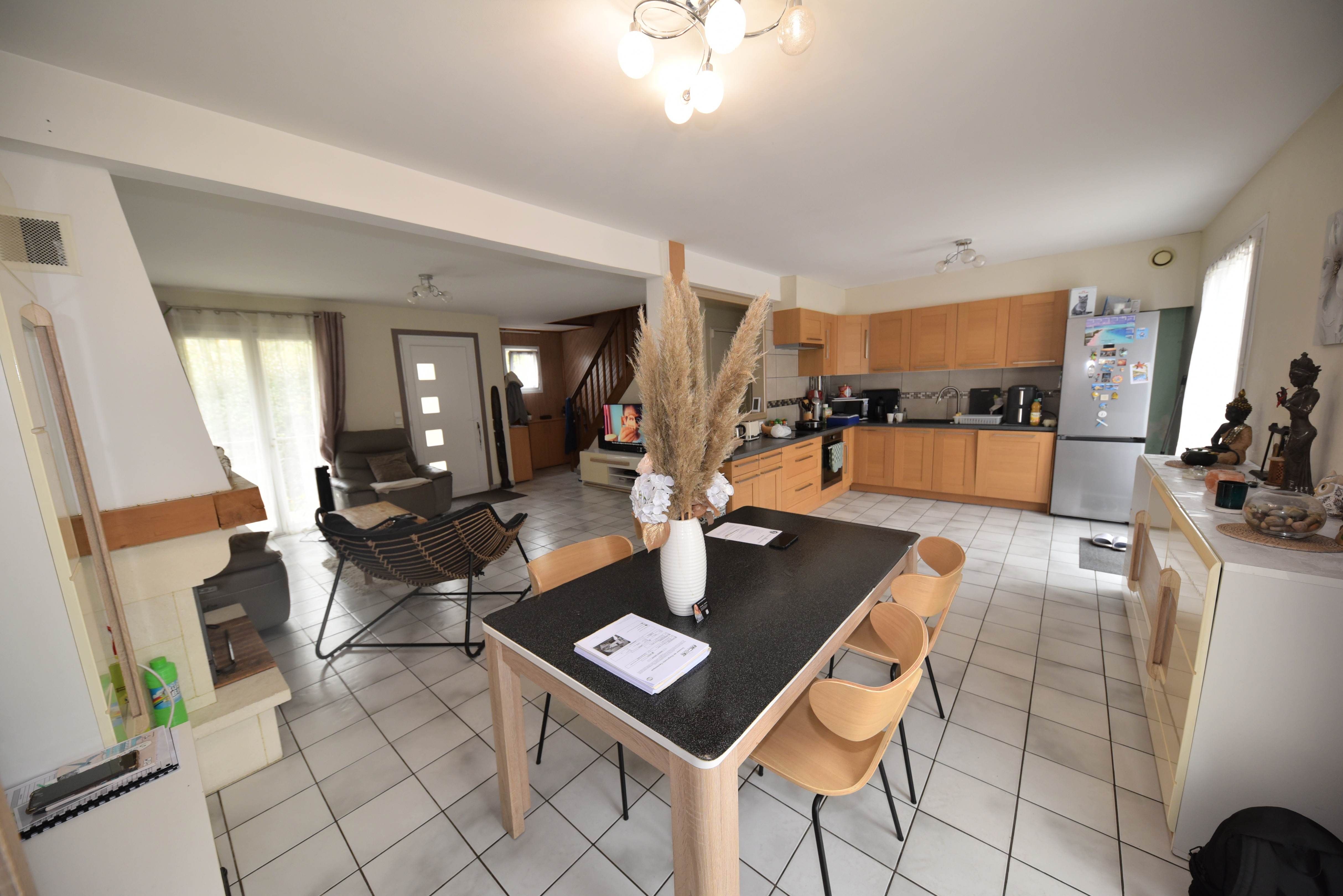 Elle est composée au rez-de-chaussée d'un beau double séjour traversant avec cheminée insert ouvert sur une grande cuisine aménagée et équipée, tous deux donnant sur une grande terrasse de 40m2, une grande chambre avec placard, wc ainsi qu'une grande salle de bain.